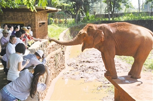 ▲市民游客在海南热带野生动植物园给大象喂食。(资料图)