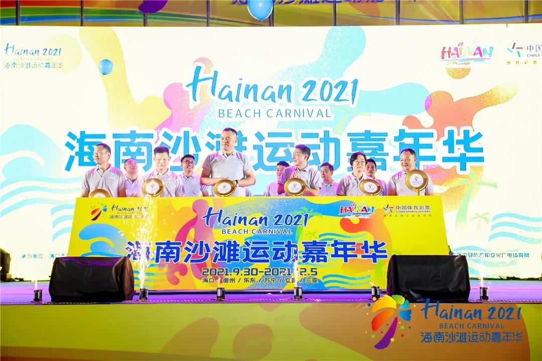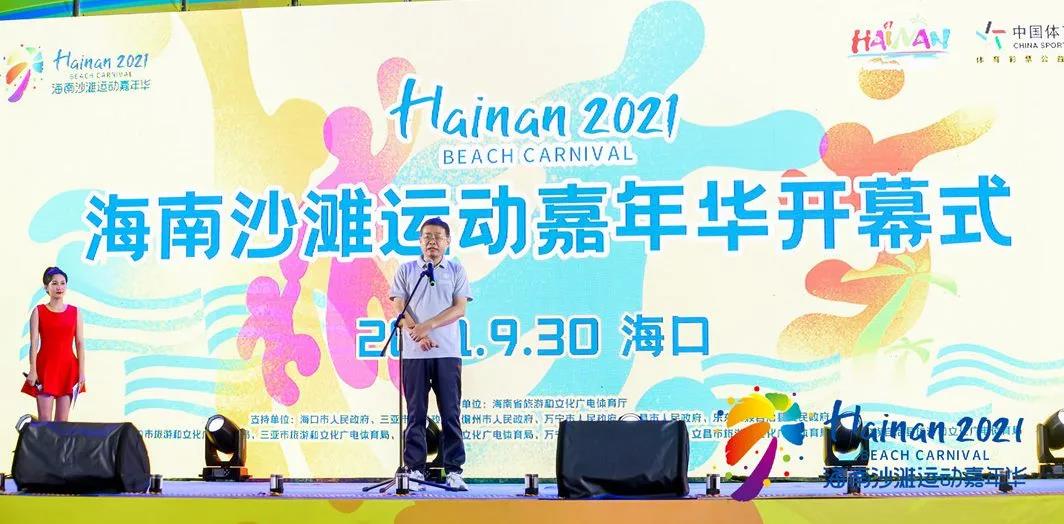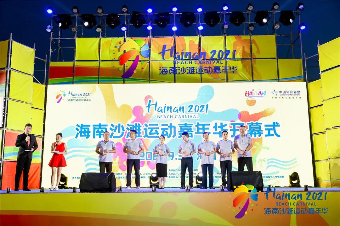 2021海南沙滩运动嘉年华开幕式在欢快的歌舞《welcome to 海南》中拉开序幕。开幕式上,海南六个市县代表亮相并授牌。省旅文厅副厅长徐翔鸿宣布2021海南沙滩运动嘉年华正式开幕。
